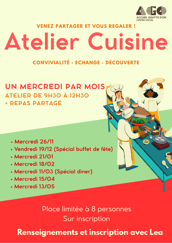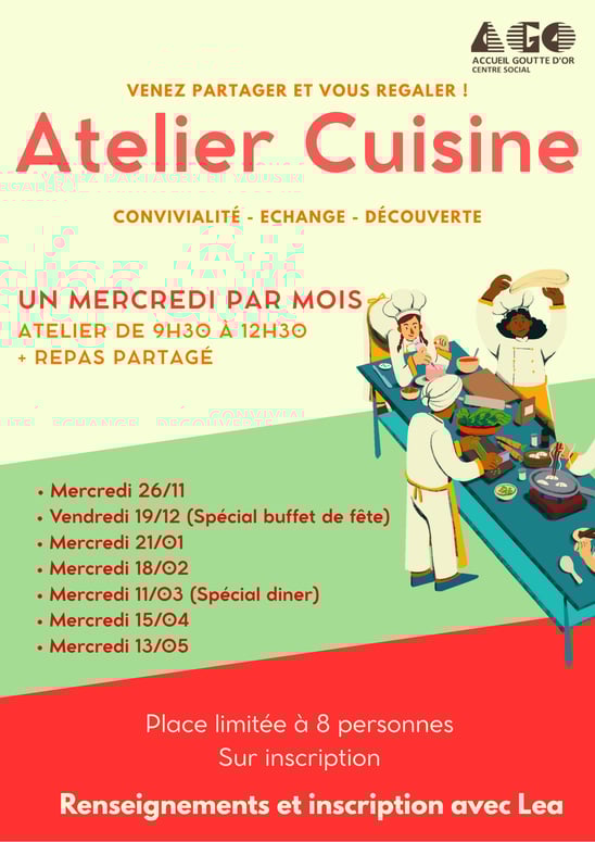 Cet atelier se déroule un mercredi par mois de 9h30 à 13h30 ouvert à tout(e) habitant(e) du quartier souhaitant partager un moment délicieux autour de la cuisine.