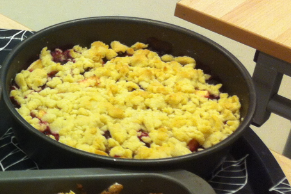 Déposez les fruits dans un petit moule à gratin, couvrez avec la pâte et enfournez pour 30 minutes.