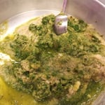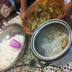 Préparation mixée : Ail (1 gousse) - gingembre (30cm) - oignons (4) - menthe (1 bouquet) - coriandre (1bouquet) - cardamone (10 graines) - girofle (une dizaine) + les 2 sachets d'épices mixées (90g)
