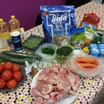 2,5 kg de riz basmati - piments verts - 2 sachets d’épices byriani (safran, piment, cumin, girofle, cannelle, cardamone, anis étoilé et muscade) - cardamone en grains - bâtons de cannelle – coriandre - clous de girofle - egg yellow powder (poudre œuf jaune) - glutamate « Ajinomoto » (poudre blanche) - une dizaine de tomates grappe - 1 kg de carottes, 500 g d’haricots verts - 1 kg pomme de terre - 1 kg oignons - 2 concombres - 4 yaourts natures - 3 kg de cuisses de poulets - Sel, poivre, huile de tournesol, vinaigre blanc