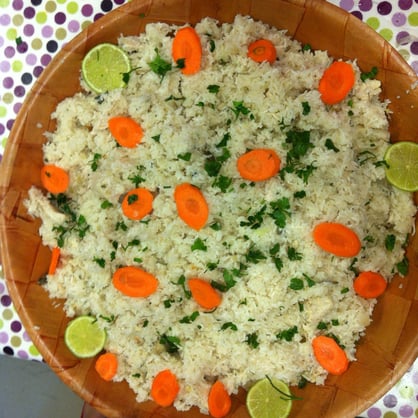5 carottes et 7 oignons en dés avec 8 yaourts natures, 1 poignée de raisins secs, 1/4 de bouquet de coriandre, 1 petite cuillère de sucre, et du sel
