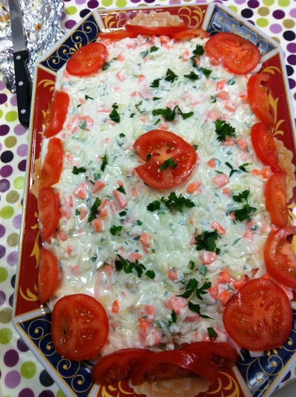 Présentez avec des rondelles de tomates, coupez comme des cœurs.