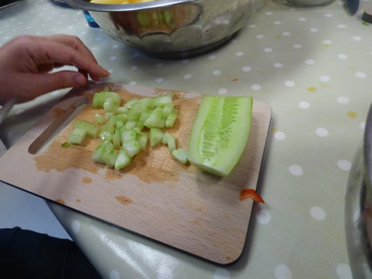 Éplucher tous les légumes et les tailler en petits dés le concombre et les poivrons