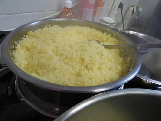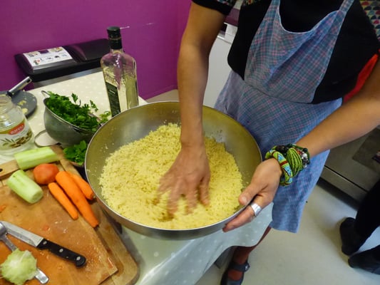 Préparer la semoule : la mettre dans un grand saladier et verser de l’eau bouillante dessus puis la faire cuire à la vapeur dans un couscousier (mettre un peu d’huile d’olive et de sel).