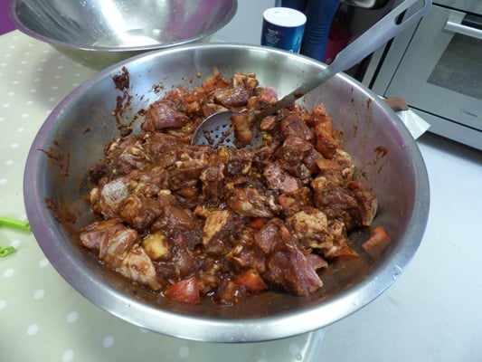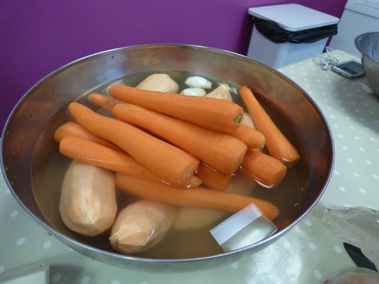 Ingrédients: 3kg de gigot d'agneau; 3kg de carottes; 500g d'oignons; 1 chou blanc 1/2; 1kg patate douce; 1 boite de concentré de tomate; 1 poivron; 5 citrons verts; 3 tête d'ail; 1 kg de tomates; bouillon jumbo; tamarin; bouillon de tomate.