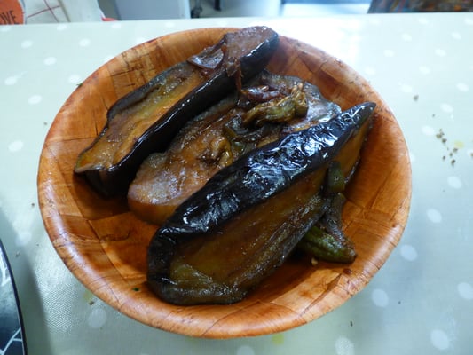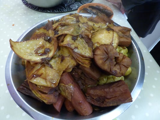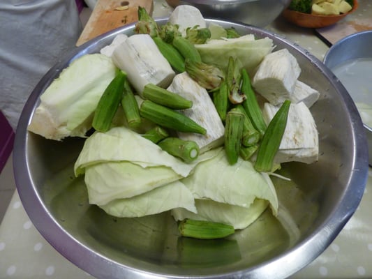 Epelucher les légumes, couper le manioc en tronçons de 8 cm, les aubergines en 2 dans le sens de la longueur, le potiron en petits quartiers, le chou en gros quartier, les carottes en 2.