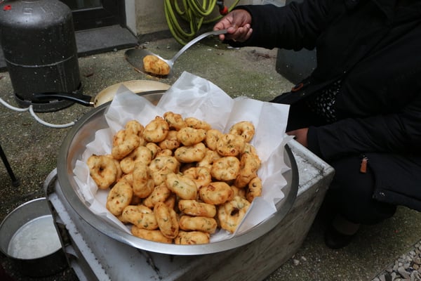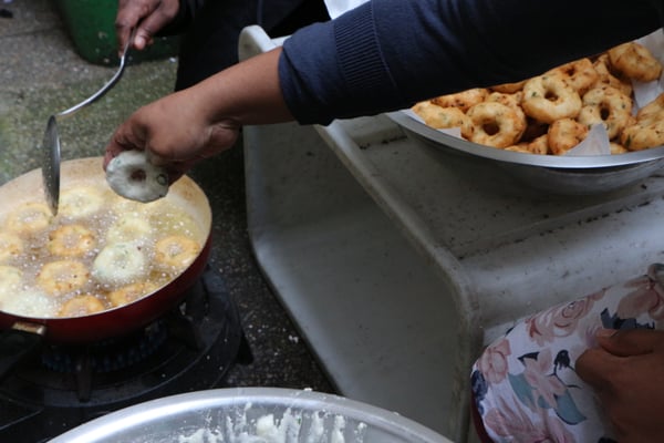 Former des petites galettes à la main et avec le pouce former un trou au milieu et faire frire