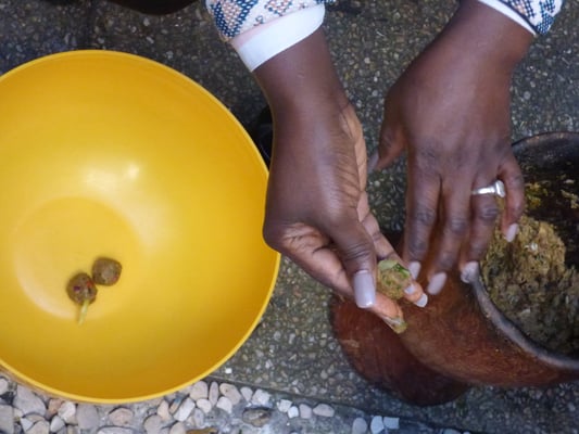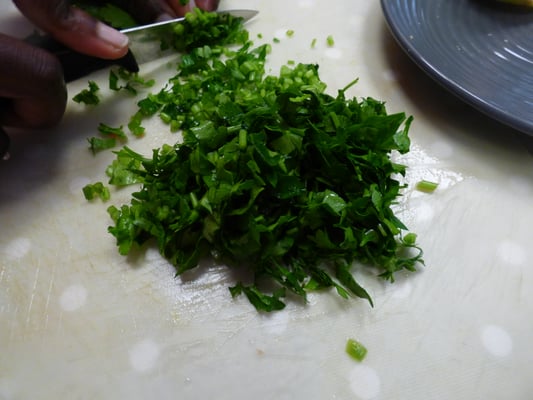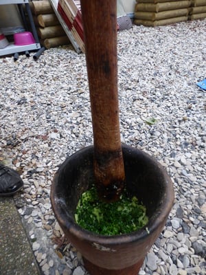 Piler l’ail avec le persil et du gingembre dans un mortier puis ajouter 1 piment rouge 2 "kubor" et 2 "jumbo" et un peu d’"adja" et continuer à piler.