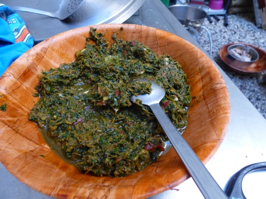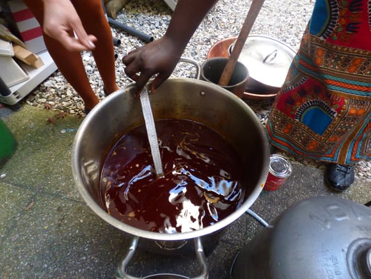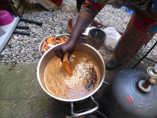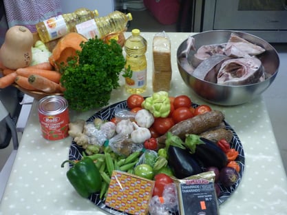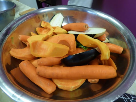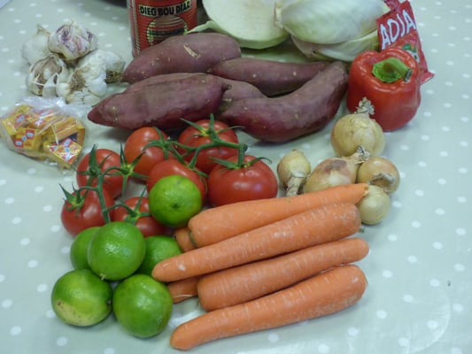 Légumes : 2 aubergines, 4/5 aubergines africaines, 2,5kg de carottes, 1 courge butternut, 800g de potiron, 350g de gombos, 3 maniocs, 1 poivron rouge, 1 poivron vert, ail, bissap blanc feuilles et fleurs, 2 racines de gingembre, persil, 3 chous verts, oignons jaunes et rouge, piment rouge, 3 citrons verts (pour la décoration)