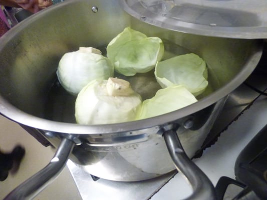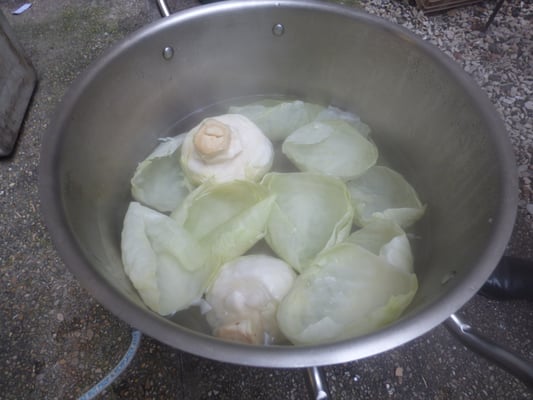 Faire bouillir une marmite d’eau, y plonger les feuilles de chou séparément, les sortir quand elles sont encore légèrement craquantes.