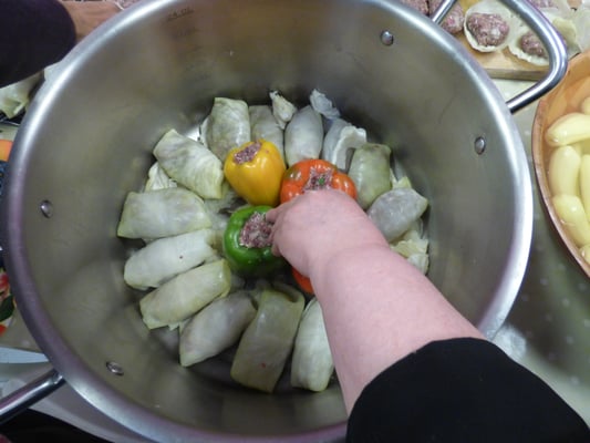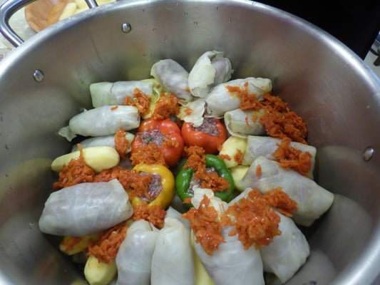 Remplir une marmite avec les feuilles de chou farcies, les poivrons, mettre le mélange carottes oignons tomates concentrées par-dessus et ajouter les pommes de terre entières par-dessus.