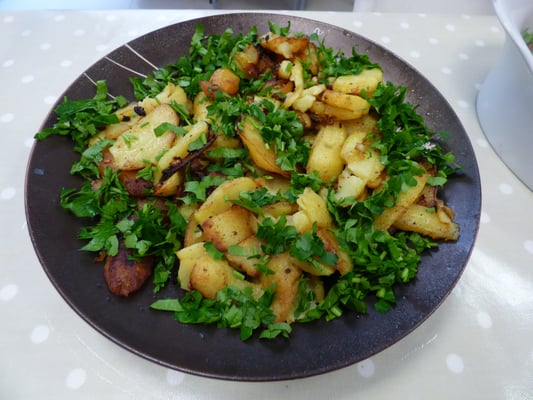 Eplucher et couper en petits les pommes de terre, les faire frire