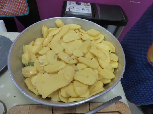 Couper les pommes de terre en lamelles, mettre de l’ail et du poivre