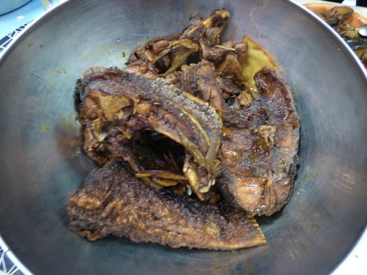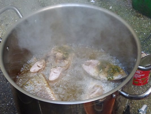 Dans une grande marmite, mettre 1 d’huile, la porter à ébullition et faire revenir le poisson.