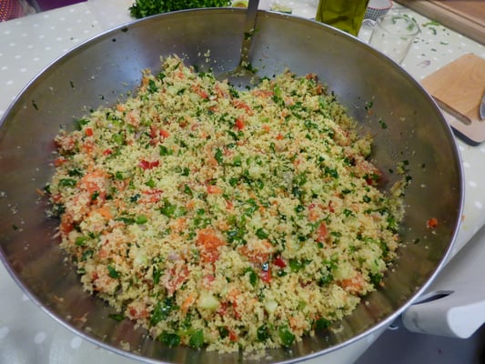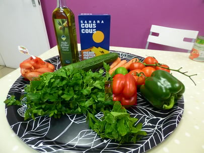 Ingrédients : 6 tomates - 3 carottes - 1 concombre - 1 citron vert - 1 poivron rouge et 1 poivron vert - 1 kg de semoule moyenne - Persil, Menthe - Huile d’olive - Échalotes