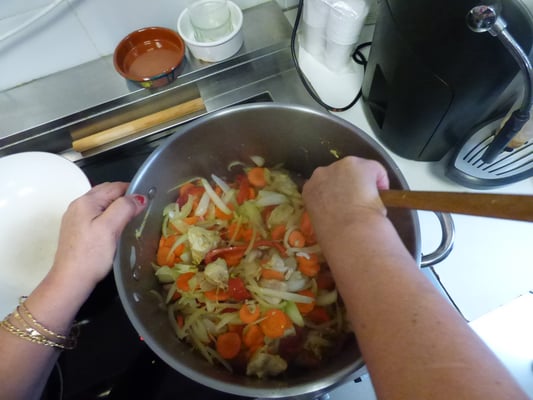 Quand la viande est dorée, la couvrir d'eau et y plonger les légumes (choux, carottes, patate douce, oignons)