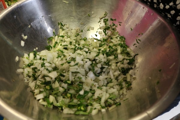 Couper les oignons, les feuilles de cari, le piment, mélanger le tout avec du fenouil et ajouter la pâte de vadey