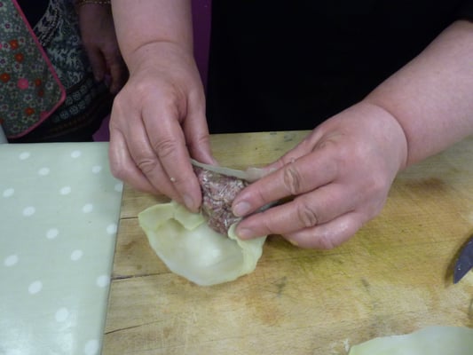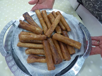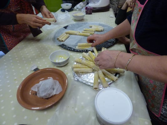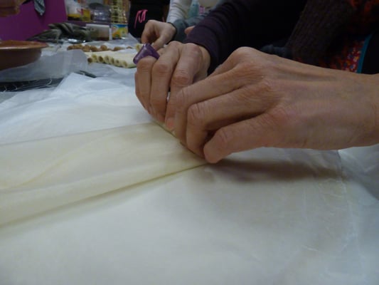 Prendre une feuille de brique, y déposer de la farce préalablement roulée dans la forme d'un doigt, rouler la feuille de brique autour.