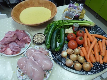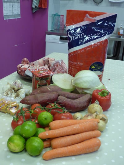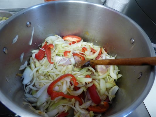 Ingrédients : 2 kg de filet de poulet - 2kg de carottes - 2 kg de pommes de terre - 1,800kg d’olives - 2 poivrons rouge - 400g de tomates pelées en boite - 280g de concentré de tomates - Ail - Curry, sel, poivre