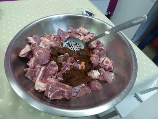 Couper et laver la viande, l'enrober de concentre de tomate.