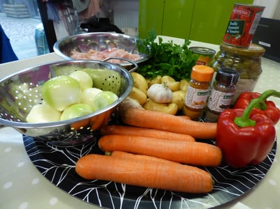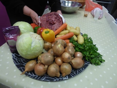 Pour 20 personnes : 2 choux, 3kg de viande de bœuf haché, gras de viande haché, 3 kg de pommes de terre, concentré de tomates, 250g de riz, 3 carottes, oignons, 4 poivrons (rouge, jaune, vert), persil